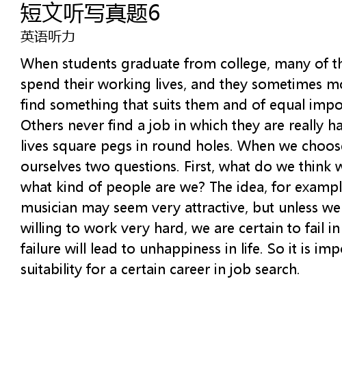| When students graduate from college, many of them do not know how they want to spend their working lives, and they sometimes move from job to job until they find something that suits them and of equal importance to which they are suited. Others never find a job in which they are really happy. They remain all their lives square pegs in round holes. When we choose our careers, we need to ask ourselves two questions. First, what do we think we would like to be? Second, what kind of people are we? The idea, for example, of being a painter or a musician may seem very attractive, but unless we have great talent and are willing to work very hard, we are certain to fail in these occupations and failure will lead to unhappiness in life. So it is important to assess our suitability for a certain career in job search. |