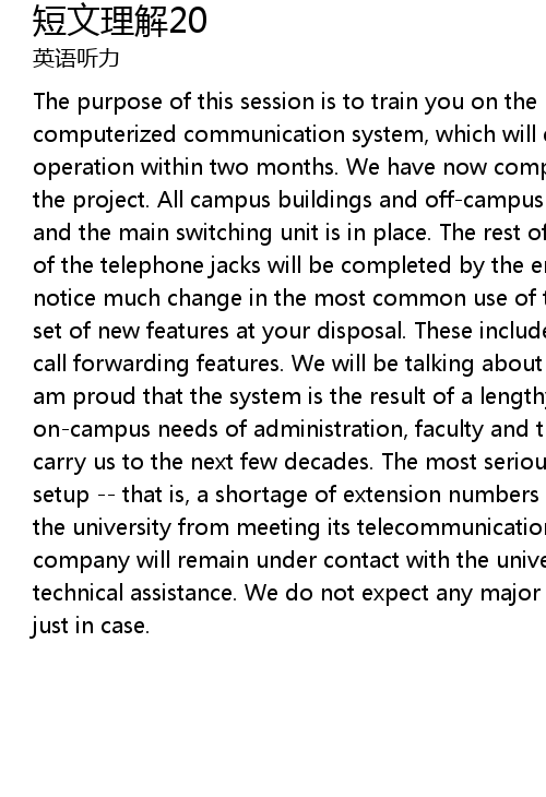 | The purpose of this session is to train you on the use of the university's new, computerized communication system, which will entirely replace the present operation within two months. We have now completed the second of three stages in the project. All campus buildings and off-campus sites have already been wired, and the main switching unit is in place. The rest of the wiring and installation of the telephone jacks will be completed by the end of this month. You won't notice much change in the most common use of the equipment, but you will have a set of new features at your disposal. These include automatic memory redial and call forwarding features. We will be talking about this later in the session. I am proud that the system is the result of a lengthy, thorough-analysis of the on-campus needs of administration, faculty and the students and will easily carry us to the next few decades. The most serious problem plaguing the current setup -- that is, a shortage of extension numbers -- will never again prevent the university from meeting its telecommunication needs. And of course, our company will remain under contact with the university to provide ongoing technical assistance. We do not expect any major problems, but we will be there just in case. |