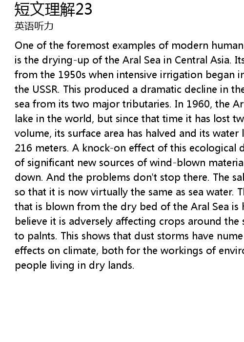 | One of the foremost examples of modern human-induced environmental degradation is the drying-up of the Aral Sea in Central Asia. Its ecological demise dates from the 1950s when intensive irrigation began in the central Asian republics of the USSR. This produced a dramatic decline in the volume of water entering the sea from its two major tributaries. In 1960, the Aral Sea was the fourth largest lake in the world, but since that time it has lost two-thirds of its total volume, its surface area has halved and its water level has dropped by more than 216 meters. A knock-on effect of this ecological disaster has been the release of significant new sources of wind-blown material, as the water level has gone down. And the problems don't stop there. The salinity of the lake has increased so that it is now virtually the same as sea water. This means that the material that is blown from the dry bed of the Aral Sea is highly saline. Scientists believe it is adversely affecting crops around the sea because salts are toxic to palnts. This shows that dust storms have numerous consequences beyond their effects on climate, both for the workings of environmental systems and for people living in dry lands. |