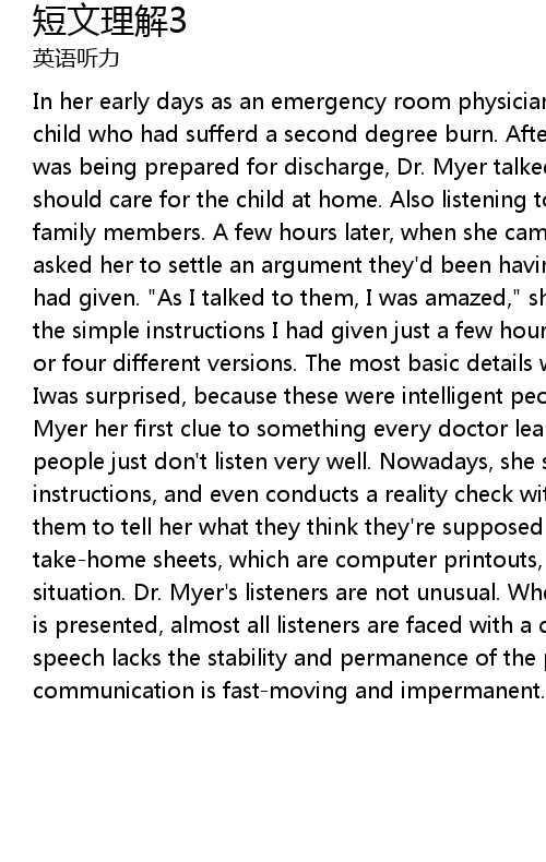 | In her early days as an emergency room physician, Dr. Joanna Myer treated a child who had sufferd a second degree burn. After the child had been treated and was being prepared for discharge, Dr. Myer talked to the parents about how they should care for the child at home. Also listening to her were half a dozen other family members. A few hours later, when she came to say goodbye, the family asked her to settle an argument they'd been having over exactly what advice she had given. "As I talked to them, I was amazed," she said. "All of them had heard the simple instructions I had given just a few hours before. But they had three or four different versions. The most basic details were unclear and confusing. Iwas surprised, because these were intelligent people." This episode gave Dr. Myer her first clue to something every doctor learns sooner or later -- most people just don't listen very well. Nowadays, she says, she repeats her instructions, and even conducts a reality check with some patients. She asks them to tell her what they think they're supposed to do. She also provides take-home sheets, which are computer printouts, tailored to the patients' situation. Dr. Myer's listeners are not unusual. When new and difficult material is presented, almost all listeners are faced with a challenge, because human speech lacks the stability and permanence of the printed word. Oral communication is fast-moving and impermanent. |