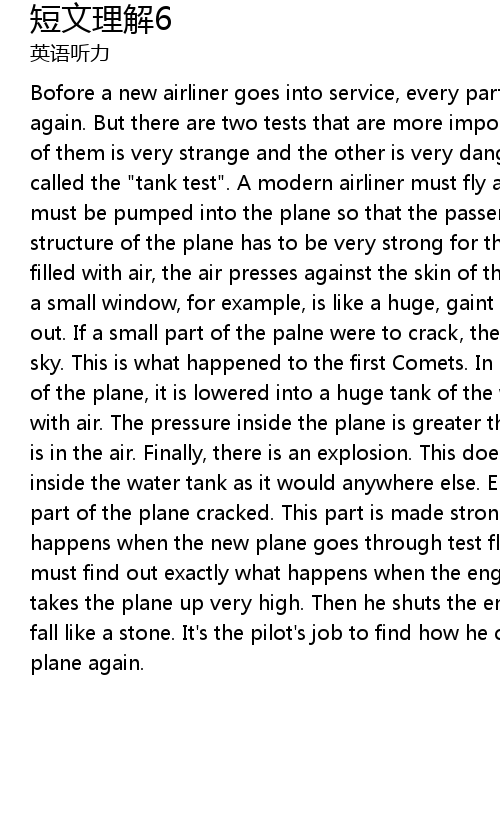 | Bofore a new airliner goes into service, every part of it is tested again and again. But there are two tests that are more important than all the others. One of them is very strange and the other is very dangerous. The first of these is called the "tank test". A modern airliner must fly at very high altitudes. Air must be pumped into the plane so that the passengers can breathe. The mental structure of the plane has to be very strong for this reason. When the plane is filled with air, the air presses against the skin of the plane. The pressure on a small window, for example, is like a huge, gaint foot that is trying to get out. If a small part of the palne were to crack, the palne would explode in the sky. This is what happened to the first Comets. In order to test the structure of the plane, it is lowered into a huge tank of the water. Then it is filled with air. The pressure inside the plane is greater than it ever will be when it is in the air. Finally, there is an explosion. This doesn't cause so much damage inside the water tank as it would anywhere else. Engineers can discover which part of the plane cracked. This part is made stronger. The most dangerous test happens when the new plane goes through test flights in the air. The test pilot must find out exactly what happens when the engines are shut off suddenly. He takes the plane up very high. Then he shuts the engine off. The plane begins to fall like a stone. It's the pilot's job to find how he can get control of the plane again. |