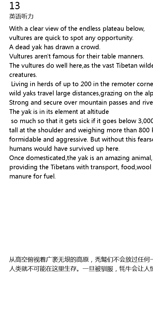 | 从高空俯视着广袤无垠的高原,秃鹫们不会放过任何一个机会。一头死牦牛吸引了一群秃鹫前来,秃鹫的就餐礼仪并不好,但在这里秃鹫们却表现的很好,因为广阔的西藏荒原有足够多的大型生物。居住在西藏高原偏远角落的野牦牛群居的数量甚至可能达到200只。他们走过遥远的距离来到高山上的冻土地带寻觅食物,依靠着山口和河流,牦牛在这里强大而安全。它们于这个海拔的环境是如此地连为一体,以至于如果他们到达海拔3000米以下,身体就会变得虚弱。牦牛身高2米,体重超过800千克。不仅自身强大还很好斗,但若没有这种看起来吓人的生物 人类就不可能在这里生存。一旦被驯服,牦牛会让人惊异万分。它为藏民提供运输,食物做衣物和帐篷的毛,还有可以做燃料的粪便。 |