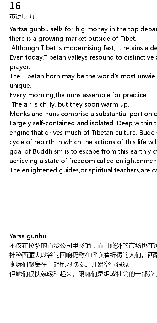 | Yarsa gunbu 不仅在拉萨的百货公司里畅销,而且藏外的市场也在逐渐变大。尽管西藏日新月异地发展,它的精神文化依旧根深蒂固。即使在今天 神秘西藏大峡谷的回响仍然在呼唤着祈祷的人们。西藏的号角或许是世界上最笨重的乐器,但是它的音色独特。每天早晨 喇嘛们聚集在一起练习吹奏。开始空气很凉 但她们很快就暖和起来。喇嘛们是组成社会的一部分,他们自控也独立,修道院的深处是推动藏文化的精神动力。佛教徒相信生命轮回,他们相信人们今生的所作所为能影响来生。佛教的目标就是通过达到一种“悟”的自由的境界,来摆脱俗世的灾难和痛苦。这种教化的领路人或精神上的老师叫做喇嘛。 |