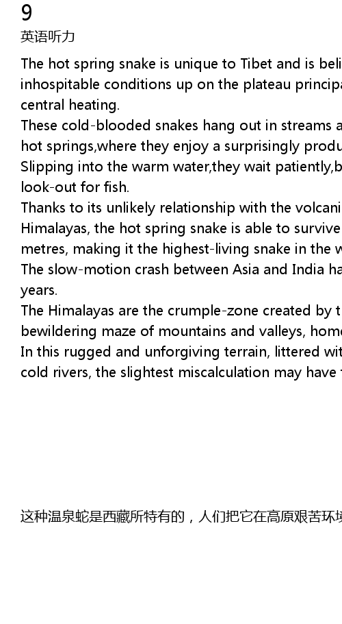 | 这种温泉蛇是西藏所特有的,人们把它在高原艰苦环境存活下来的原因,主要归功于这里的天然地热。这些冷血的蛇在由温泉形成的溪流中游弋,在温泉中它们无忧无虑的生活着。滑进温暖的水中耐心地等待,脑袋在水面上下疾动静等鱼儿上钩。正由于与形成喜马拉雅山的火山的不寻常关系,温泉蛇才得以生存在。海拔4500米的地方,这使它成为了世界上过着最奢侈的生活的蛇。亚洲和印度板块之间的缓慢运动,已经持续了3千万年之久。喜马拉雅山脉就是这两个大陆板块撞击后的结果,它是一个山峦和山谷的迷宫,也是各种难以捉摸的野生动物的家园。在这个多岩的恶劣环境中,散落着各种碎石和冰冷的河流,极微小的失误也可能导致致命的后果。 |