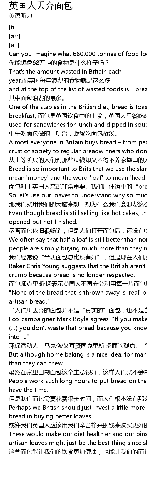 | [01:39.11] | Perhaps we British should just invest a little more of our hard-earned bread in buying better loaves. 或许我们英国人应该用我们辛苦挣来的钱来购买更好的面包。 |
