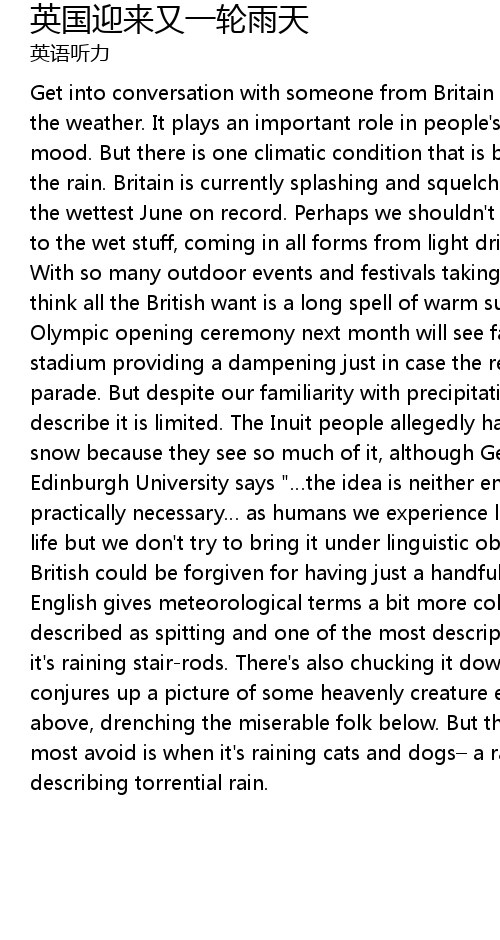 | Get into conversation with someone from Britain and they will invariably mention the weather. It plays an important role in people' s lives and determines their mood. But there is one climatic condition that is bound to make us complain the rain. Britain is currently splashing and squelching its way through probably the wettest June on record. Perhaps we shouldn' t be surprised as the UK is used to the wet stuff, coming in all forms from light drizzle to a heavy downpour. With so many outdoor events and festivals taking place this summer you would think all the British want is a long spell of warm sunshine. But London' s Olympic opening ceremony next month will see fake clouds hovering over the stadium providing a dampening just in case the real stuff fails to rain on the parade. But despite our familiarity with precipitation our vocabulary to describe it is limited. The Inuit people allegedly have 50 words to describe snow because they see so much of it, although Geoff Pullman, a linguist from Edinburgh University says " the idea is neither empirically true nor practically necessary as humans we experience lots of variety in everyday life but we don' t try to bring it under linguistic observation." Given that, the British could be forgiven for having just a handful of words. However colloquial English gives meteorological terms a bit more colour. A few drops of rain is described as spitting and one of the most descriptive phrases for heavy rain is it' s raining stairrods. There' s also chucking it down and bucketing down which conjures up a picture of some heavenly creature emptying buckets of water from above, drenching the miserable folk below. But the weather you might want to most avoid is when it' s raining cats and dogs a rather cruel way of describing torrential rain. |