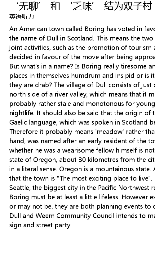 | An American town called Boring has voted in favour of pairing with a village by the name of Dull in Scotland. This means the two of them will participate in joint activities, such as the promotion of tourism and cultural exchange. Boring decided in favour of the move after being approached by the residents of Dull. But what's in a name? Is Boring really tiresome and is Dull tedious? Are these places in themselves humdrum and insipid or is it just their names which suggest they are drab? The village of Dull consists of just one row of houses on the north side of a river valley, which means that it must be very peaceful but probably rather stale and monotonous for young people looking for exciting nightlife. It should also be said that the origin of the name Dull is from the Gaelic language, which was spoken in Scotland before the arrival of the English. Therefore it probably means 'meadow' rather than mundane. Boring, on the other hand, was named after an early resident of the town, William H. Boring, though whether he was a wearisome fellow himself is not known. The town lies in the state of Oregon, about 30 kilometres from the city of Portland. Is it flat? Not in a literal sense. Oregon is a mountainous state. And Boring's residents insist that the town is "The most exciting place to live". However, in comparison to Seattle, the biggest city in the Pacific Northwest region of the United States, Boring must be at least a little lifeless. However exciting the communities may or may not be, they are both planning events to celebrate their pairing. The Dull and Weem Community Council intends to mark the partnership with a new road sign and street party. |