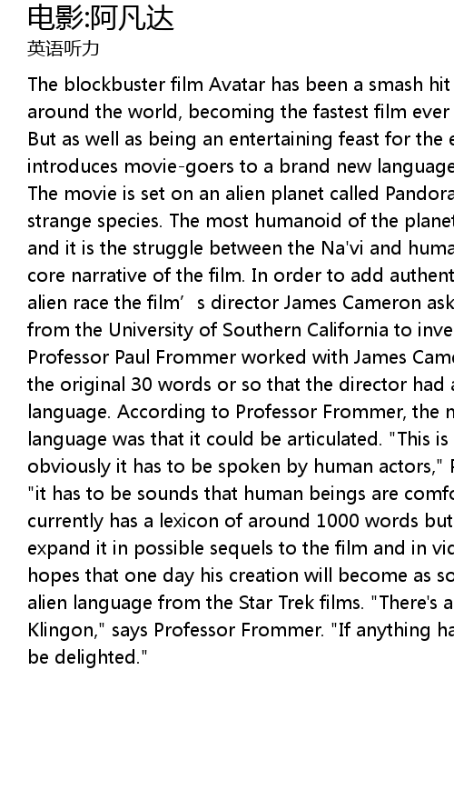 | The blockbuster film Avatar has been a smash hit at the box office in the UK and around the world, becoming the fastest film ever to earn 1bn in ticket sales. But as well as being an entertaining feast for the eyes, the scifi epic also introduces moviegoers to a brand new language invented especially for the film. The movie is set on an alien planet called Pandora which is inhabited by many strange species. The most humanoid of the planet' s inhabitants are the Na' vi, and it is the struggle between the Na' vi and human interlopers that forms the core narrative of the film. In order to add authenticity to his vision of an alien race the film' s director James Cameron asked a professor of linguistics from the University of Southern California to invent a language for the Na' vi. Professor Paul Frommer worked with James Cameron for four years to build upon the original 30 words or so that the director had already come up with for the language. According to Professor Frommer, the most important aspect of the Na' vi language was that it could be articulated. " This is an alien language but obviously it has to be spoken by human actors," Professor Frommer told the BBC, " it has to be sounds that human beings are comfortable producing." The language currently has a lexicon of around 1000 words but Professor Frommer hopes to expand it in possible sequels to the film and in video games. The professor hopes that one day his creation will become as sophisticated as the Klingon alien language from the Star Trek films. " There' s a translation of Hamlet into Klingon," says Professor Frommer. " If anything happened like this with Na' vi I' d be delighted." |