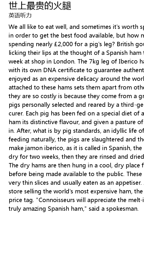 | We all like to eat well, and sometimes it' s worth spending that little bit extra in order to get the best food available, but how many of us would consider spending nearly 2, 000 for a pig' s leg? British gourmets with money to burn are licking their lips at the thought of a Spanish ham that has gone on sale this week at shop in London. The 7kg leg of Iberico ham costs 1, 800 and even comes with its own DNA certificate to guarantee authenticity. Cured ham has long been enjoyed as an expensive delicacy around the world but the hefty price tag attached to these hams sets them apart from other similar products. The reason they are so costly is because they come from a group of only 50 black Iberian pigs personally selected and reared by a thirdgeneration Iberian pig farmer and curer. Each pig has been fed on a special diet of acorns and roots to give the ham its distinctive flavour, and given a pasture of ten hectares each to live in. After, what is by pig standards, an idyllic life of roaming oak groves and feeding naturally, the pigs are slaughtered and the curing process begins. To make jamon iberico, as it is called in Spanish, the hams are salted and left to dry for two weeks, then they are rinsed and dried for another four to six weeks. The dry hams are then hung in a cool, dry place for between 12 and 36 months before being made available to the public. These kinds of ham are served raw in very thin slices and usually eaten as an appetiser. According to the London store selling the world' s most expensive ham, the taste more than justifies the price tag. " Connoisseurs will appreciate the meltinthemouth texture of this truly amazing Spanish ham," said a spokesman. |