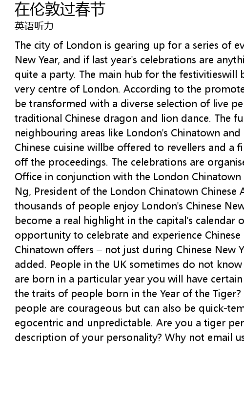 | The city of London is gearing up for a series of events to celebrate the Chinese New Year, and if last year' s celebrations are anything to go by it should be quite a party. The main hub for the festivitieswill be Trafalgar Square in the very centre of London. According to the promoters of the party, the square will be transformed with a diverse selection of live performances including a traditional Chinese dragon and lion dance. The fun will spread to other neighbouring areas like London' s Chinatown and Leicester Square where authentic Chinese cuisine willbe offered to revellers and a fireworks display will round off the proceedings. The celebrations are organised by the Mayor of London' s Office in conjunction with the London Chinatown Chinese Association. Mr Leslie Ng, President of the London Chinatown Chinese Association, said: " Hundreds of thousands of people enjoy London' s Chinese New Year celebrations, which have become a real highlight in the capital' s calendar of events. " It' s an opportunity to celebrate and experience Chinese culture, and to see what Chinatown offers not just during Chinese New Year, but all year round," he added. People in the UK sometimes do not know that in the Chinese zodiac if you are born in a particular year you will have certain characteristics. So what are the traits of people born in the Year of the Tiger? Most people agree that tiger people are courageous but can also be quicktempered. They may also be very egocentric and unpredictable. Are you a tiger person? Do you agree with this description of your personality? Why not email us and let us know your thoughts? |