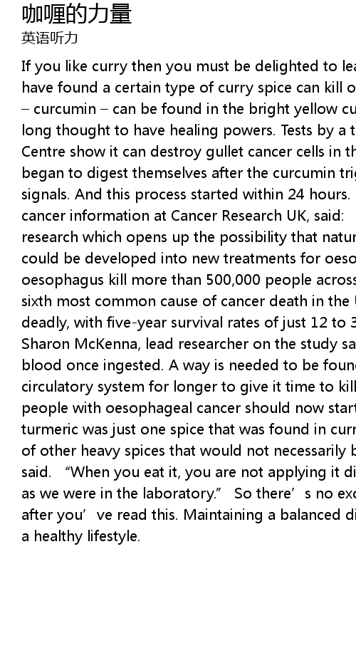 | If you like curry then you must be delighted to learn that scientists in Ireland have found a certain type of curry spice can kill off cancer cells. The chemical curcumin can be found in the bright yellow curry spice turmeric. It' s long thought to have healing powers. Tests by a team at the Cork Cancer Research Centre show it can destroy gullet cancer cells in the lab. The cancer cells began to digest themselves after the curcumin triggered lethal cell death signals. And this process started within 24 hours. Dr Lesley Walker, director of cancer information at Cancer Research UK, said: " This is an interesting research which opens up the possibility that natural chemicals found in turmeric could be developed into new treatments for oesophageal cancer." Cancers of the oesophagus kill more than 500, 000 people across the world each year. It' s the sixth most common cause of cancer death in the UK. The tumours are especially deadly, with fiveyear survival rates of just 12 to 31 percent. However Dr Sharon McKenna, lead researcher on the study says turmeric is broken down in the blood once ingested. A way is needed to be found to ensure it stayed in the circulatory system for longer to give it time to kill cancer cells. Asked if people with oesophageal cancer should now start eating lots of curries, she said turmeric was just one spice that was found in curry. " A curry contains a lot of other heavy spices that would not necessarily be good for you at all," she said. " When you eat it, you are not applying it directly to the cancer cells as we were in the laboratory." So there' s no excuse to binge on curry meals after you' ve read this. Maintaining a balanced diet remains our best option to a healthy lifestyle. |