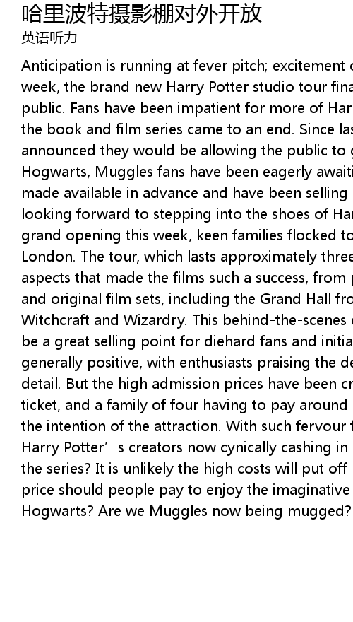 | Anticipation is running at fever pitch excitement off the scale. Now, this week, the brand new Harry Potter studio tour finally opened its doors to the public. Fans have been impatient for more of Harry Potter and his friends since the book and film series came to an end. Since last year, when Warner Bros. announced they would be allowing the public to get a glimpse inside the world of Hogwarts, Muggles fans have been eagerly awaiting the opening day. Tickets were made available in advance and have been selling like hot cakes, with fans looking forward to stepping into the shoes of Harry Potter. So after a fanfare grand opening this week, keen families flocked to the new attraction in north London. The tour, which lasts approximately three hours, highlights many of the aspects that made the films such a success, from props and costumes, to models and original film sets, including the Grand Hall from Hogwart' s school of Witchcraft and Wizardry. This behindthescenes experience was always going to be a great selling point for diehard fans and initial reviews have been generally positive, with enthusiasts praising the decoration and attention to detail. But the high admission prices have been criticised. At 28 for an adult ticket, and a family of four having to pay around 85, critics have questioned the intention of the attraction. With such fervour for the books and films, are Harry Potter' s creators now cynically cashing in on the global popularity of the series? It is unlikely the high costs will put off most fans, but at what price should people pay to enjoy the imaginative world of Harry, Hermione and Hogwarts? Are we Muggles now being mugged? |
