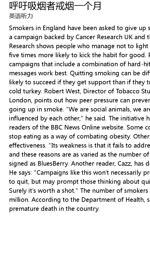 | Smokers in England have been asked to give up smoking for 28 days this month, in a campaign backed by Cancer Research UK and the British Heart Foundation. Research shows people who manage not to light up for this length of time are five times more likely to kick the habit for good. Public health experts say campaigns that include a combination of hard-hitting adverts and supportive messages work best. Quitting smoking can be difficult. People are much more likely to succeed if they get support than if they try to do it alone and go cold turkey. Robert West, Director of Tobacco Studies at University College London, points out how peer pressure can prevent a tobacco addict's resolve going up in smoke. "We are social animals, we are herd animals and we are influenced by each other," he said. The initiative has met some scepticism among readers of the BBC News Online website. Some compared it to asking people to stop eating as a way of combating obesity. Others doubt the campaign's effectiveness. "Its weakness is that it fails to address why a person smokes, and these reasons are as varied as the number of smokers", says someone who signed as BluesBerry. Another reader, Cazz, has decided to give it some credit. He says: "Campaigns like this won't necessarily prompt the majority of smokers to quit, but may prompt those thinking about quitting to set a date and try. Surely it's worth a shot." The number of smokers in England is estimated at 8 million. According to the Department of Health, smoking is the biggest cause of premature death in the country. |