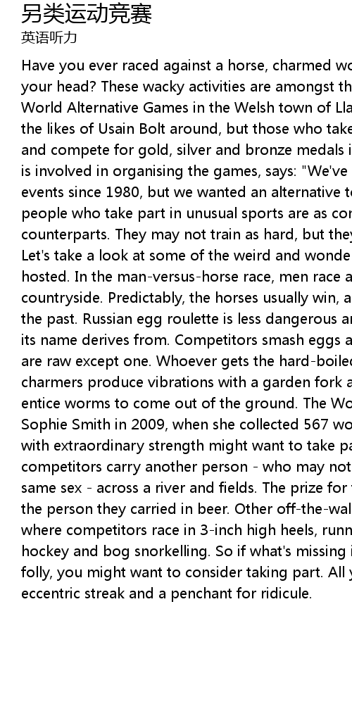 | Have you ever raced against a horse, charmed worms or smashed an egg against your head? These wacky activities are amongst the sports taking place in the World Alternative Games in the Welsh town of Llanwrtyd Wells. You might not see the likes of Usain Bolt around, but those who take part are extremely dedicated and compete for gold, silver and bronze medals in 35 events. Gordon Green, who is involved in organising the games, says: "We've been staging a number of events since 1980, but we wanted an alternative to the Olympics to show that people who take part in unusual sports are as committed as their Olympic counterparts. They may not train as hard, but they have easily as much fun." Let's take a look at some of the weird and wonderful disciplines that are hosted. In the man-versus-horse race, men race against horses across the Welsh countryside. Predictably, the horses usually win, although men have won twice in the past. Russian egg roulette is less dangerous and more quirky that the sport its name derives from. Competitors smash eggs against their heads: all the eggs are raw except one. Whoever gets the hard-boiled egg is the winner. Worm charmers produce vibrations with a garden fork and a piece of metal or wood to entice worms to come out of the ground. The World Record was set by ten-year-old Sophie Smith in 2009, when she collected 567 worms in just 30 minutes. Those with extraordinary strength might want to take part in wife carrying, where competitors carry another person - who may not be their wife and can be of the same sex - across a river and fields. The prize for the winner is the weight of the person they carried in beer. Other off-the-wall games are stiletto racing, where competitors race in 3-inch high heels, running backwards, underwater hockey and bog snorkelling. So if what's missing in your life is a grain of folly, you might want to consider taking part. All you need is dedication, an eccentric streak and a penchant for ridicule. |
