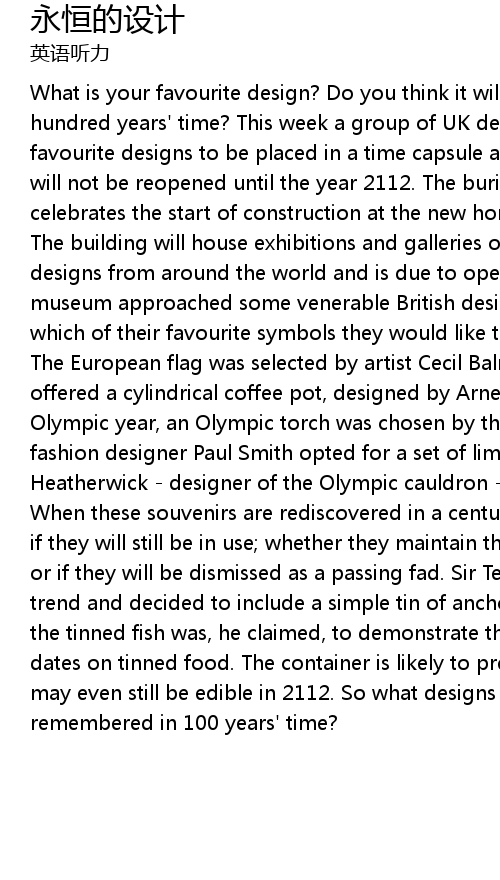 | What is your favourite design? Do you think it will still be stylish in a hundred years' time? This week a group of UK designers have submitted their favourite designs to be placed in a time capsule and buried underground - it will not be reopened until the year 2112. The burial of the sealed container celebrates the start of construction at the new home of London's Design Museum. The building will house exhibitions and galleries of contemporary and classic designs from around the world and is due to open to the public in 2015. The museum approached some venerable British designers and architects to ask them which of their favourite symbols they would like to see placed in the capsule. The European flag was selected by artist Cecil Balmond, while Kenneth Grange offered a cylindrical coffee pot, designed by Arne Jacobsen. As 2012 is London's Olympic year, an Olympic torch was chosen by the director of the museum. British fashion designer Paul Smith opted for a set of limited edition stamps and Thomas Heatherwick - designer of the Olympic cauldron - picked a standard light bulb. When these souvenirs are rediscovered in a century's time, no one really knows if they will still be in use; whether they maintain their status as style icons, or if they will be dismissed as a passing fad. Sir Terence Conran bucked the trend and decided to include a simple tin of anchovies. His idea for including the tinned fish was, he claimed, to demonstrate the ineffective use of expiry dates on tinned food. The container is likely to preserve the contents and it may even still be edible in 2112. So what designs do you think deserve to be remembered in 100 years' time? |