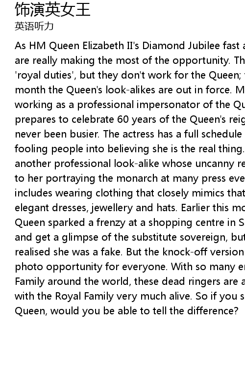 | As HM Queen Elizabeth II's Diamond Jubilee fast approaches, one group of people are really making the most of the opportunity. These people are unique in their 'royal duties', but they don't work for the Queen; they impersonate her. This month the Queen's look-alikes are out in force. Margaret Southcoat has been working as a professional impersonator of the Queen for 13 years. As Britain prepares to celebrate 60 years of the Queen's reign, she says her diary has never been busier. The actress has a full schedule of events where she will be fooling people into believing she is the real thing. Elizabeth Richard is another professional look-alike whose uncanny resemblance to the Queen has led to her portraying the monarch at many press events. Her attention to detail includes wearing clothing that closely mimics that of Her Majesty, including elegant dresses, jewellery and hats. Earlier this month, another counterfeit Queen sparked a frenzy at a shopping centre in Shanghai. Crowds flocked to try and get a glimpse of the substitute sovereign, but after a double-take they soon realised she was a fake. But the knock-off version still provided an amusing photo opportunity for everyone. With so many enthusiastic fans of the Royal Family around the world, these dead ringers are able to keep the fascination with the Royal Family very much alive. So if you saw someone who looked like the Queen, would you be able to tell the difference? |