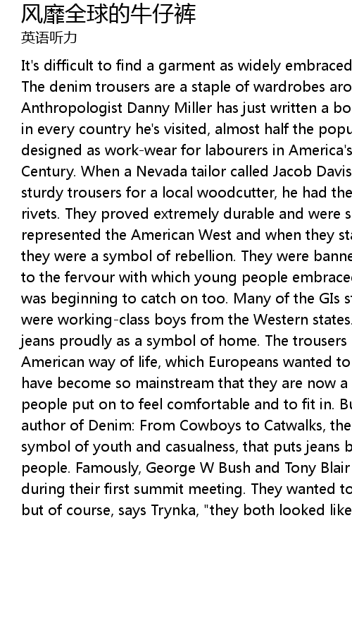 | It's difficult to find a garment as widely embraced, worn and loved as jeans. The denim trousers are a staple of wardrobes around the world. But why? Anthropologist Danny Miller has just written a book on the subject. He says that in every country he's visited, almost half the population wore jeans. They were designed as work-wear for labourers in America's Western states in the late 19th Century. When a Nevada tailor called Jacob Davis was asked to make a pair of sturdy trousers for a local woodcutter, he had the idea of reinforcing them with rivets. They proved extremely durable and were soon in high demand. Jeans represented the American West and when they started to be worn as casual wear, they were a symbol of rebellion. They were banned in schools, which only added to the fervour with which young people embraced them. Outside America the trend was beginning to catch on too. Many of the GIs stationed abroad during the war were working-class boys from the Western states. While off duty they wore their jeans proudly as a symbol of home. The trousers represented an easier, happier American way of life, which Europeans wanted to buy into. Miller argues they have become so mainstream that they are now a symbol of the ordinary - a garment people put on to feel comfortable and to fit in. But according to Paul Trynka, author of Denim: From Cowboys to Catwalks, there is still something in their symbol of youth and casualness, that puts jeans beyond the reach of certain people. Famously, George W Bush and Tony Blair went out on the street in denim during their first summit meeting. They wanted to show they were 'regular guys' but of course, says Trynka, "they both looked like dorks." |
