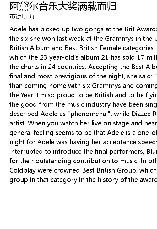| Adele has picked up two gongs at the Brit Awards ceremony in London to add to the six she won last week at the Grammys in the USA. She triumphed in the Best British Album and Best British Female categories. It caps a stellar year in which the 23 year-old's album 21 has sold 17 million copies worldwide and topped the charts in 24 countries. Accepting the Best Album accolade, which was the final and most prestigious of the night, she said: "Nothing makes me prouder than coming home with six Grammys and coming to the Brits and winning Album of the Year. I'm so proud to be British and to be flying our flag." The great and the good from the music industry have been singing her praises. Kylie Minogue described Adele as "phenomenal", while Dizzee Rascal added: "She's a genuine artist. When you watch her live on stage and hear her, she's the real deal." The general feeling seems to be that Adele is a one-off. The only thing marring the night for Adele was having her acceptance speech cut short. The presenter interrupted to introduce the final performers, Blur, who themselves won a trophy for their outstanding contribution to music. In other news from the ceremony, Coldplay were crowned Best British Group, which makes them the most successful group in that category in the history of the awards. |