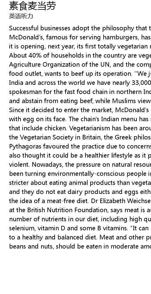 | Successful businesses adopt the philosophy that the customer is always right and McDonald's, famous for serving hamburgers, hasn't ignored that. So much so that it is opening, next year, its first totally vegetarian restaurant in India. About 40% of households in the country are vegetarian, according to the Food and Agriculture Organization of the UN, and the company, the world's second biggest food outlet, wants to beef up its operation. ''We just have 271 restaurants in India and across the world we have nearly 33,000'', said Rajesh Kumar Maini, a spokesman for the fast food chain in northern India. Hindus see cows as sacred and abstain from eating beef, while Muslims view pigs as unclean and avoid pork. Since it decided to enter the market, McDonald's has tried not to risk ending up with egg on its face. The chain's Indian menu has some meat-free dishes and some that include chicken. Vegetarianism has been around for centuries. According to the Vegetarian Society in Britain, the Greek philosopher and mathematician Pythagoras favoured the practice due to concerns about cruelty to animals. He also thought it could be a healthier lifestyle as it prevented men from being violent. Nowadays, the pressure on natural resources from rearing animals has been turning environmentally-conscious people into veggies. Some people are even stricter about eating animal products than vegetarians. They are known as vegans and they do not eat dairy products and eggs either. But some experts frown upon the idea of a meat-free diet. Dr Elizabeth Weichselbaum, a nutritional scientist at the British Nutrition Foundation, says meat is an important source of a number of nutrients in our diet, including high quality protein, iron, zinc, selenium, vitamin D and some B vitamins. "It can make an important contribution to a healthy and balanced diet. Meat and other protein sources, including eggs, beans and nuts, should be eaten in moderate amounts." |
