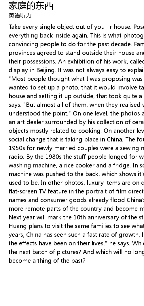 | Take every single object out of you r house. Pose for a photo. Then, put everything back inside again. This is what photographer Huang Qingjun has been convincing people to do for the past decade. Families from 14 of China' s 33 provinces agreed to stand outside their house and pose for Mr Huang with all their possessions. An exhibition of his work, called ' Belongings', is now on display in Beijing. It was not always easy to explain the object of the project. " Most people thought what I was proposing was not normal. When I explained I wanted to set up a photo, that it would involve taking everything out of their house and setting it up outside, that took quite a lot of explaining," Mr. Huang says. " But almost all of them, when they realised what I was trying to do, they understood the point." On one level, the photos are intimate family portraits: an art dealer surrounded by his collection of ceramics, or a fishing family with objects mostly related to cooking. On another level, the pictures capture the social change that is taking place in China. The four most soughtafter items in 1950s for newly married couples were a sewing machine, a bicycle, a watch and a radio. By the 1980s the stuff people longed for was quite different: a TV, a washing machine, a rice cooker and a fridge. In some pictures, the sewing machine was pushed to the back, which shows it' s no longer as desirable as it used to be. In other photos, luxury items are on display: a BMW car and a flatscreen TV feature in the portrait of film director Zhang Yuan. Since brand names and consumer goods already flood China' s cities, will these soon reach the more remote parts of the country and become more prominent in Mr. Huang' s snaps? Next year will mark the 10th anniversary of the start of the project, and Mr. Huang plans to visit the same families to see what has changed. " In the last 10 years, China has seen such a fast rate of growth, I want to go back and see what the effects have been on their lives," he says. Which new goods will appear in the next batch of pictures? And which will no longer feature because they' ve become a thing of the past? |