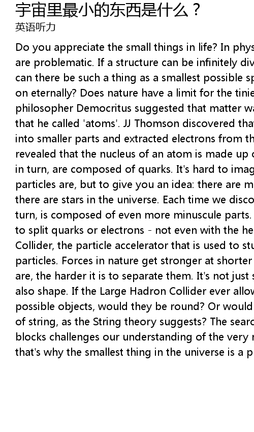 | Do you appreciate the small things in life? In physics, infinitely small things are problematic. If a structure can be infinitely divided into smaller parts, can there be such a thing as a smallest possible space or does this division go on eternally? Does nature have a limit for the tiniest possible unit? The Greek philosopher Democritus suggested that matter was made of minute, round particles that he called 'atoms'. JJ Thomson discovered that atoms could be split further into smaller parts and extracted electrons from these. Experiments since have revealed that the nucleus of an atom is made up of protons and neutrons, which, in turn, are composed of quarks. It's hard to imagine just how small these particles are, but to give you an idea: there are more atoms in each of us than there are stars in the universe. Each time we discover a smaller unit, this, in turn, is composed of even more minuscule parts. But scientists haven't been able to split quarks or electrons - not even with the help of the Large Hadron Collider, the particle accelerator that is used to study the smallest known particles. Forces in nature get stronger at shorter distances; the smaller they are, the harder it is to separate them. It's not just size that matters, but also shape. If the Large Hadron Collider ever allows us to study the smallest possible objects, would they be round? Or would they look like microscopic bits of string, as the String theory suggests? The search for the smallest building blocks challenges our understanding of the very nature of space and time. And that's why the smallest thing in the universe is a pretty big deal. |