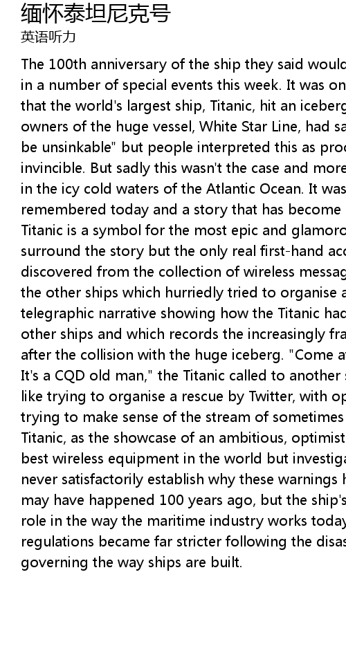 | The 100th anniversary of the ship they said would never sink has been remembered in a number of special events this week. It was on the night of April 15th 1912 that the world's largest ship, Titanic, hit an iceberg on her maiden voyage. The owners of the huge vessel, White Star Line, had said the ship was "designed to be unsinkable" but people interpreted this as proof that it was completely invincible. But sadly this wasn't the case and more than 1,500 people perished in the icy cold waters of the Atlantic Ocean. It was a tragedy that is still remembered today and a story that has become part of the popular imagination.The Titanic is a symbol for the most epic and glamorous failure. Myths and legends surround the story but the only real first-hand account of what happened can be discovered from the collection of wireless messages sent between the Titanic and the other ships which hurriedly tried to organise a rescue operation. It is a telegraphic narrative showing how the Titanic had been given warnings of ice by other ships and which records the increasingly frantic calls for assistance after the collision with the huge iceberg. "Come at once. We have struck a berg. It's a CQD old man," the Titanic called to another ship, the Carpathia. It was like trying to organise a rescue by Twitter, with operators on other ships trying to make sense of the stream of sometimes contradictory information. The Titanic, as the showcase of an ambitious, optimistic era, had the biggest and best wireless equipment in the world but investigations after the sinking would never satisfactorily establish why these warnings had been ignored. Its sinking may have happened 100 years ago, but the ship's legacy still plays an important role in the way the maritime industry works today. International safety regulations became far stricter following the disaster and these rules are still governing the way ships are built. |