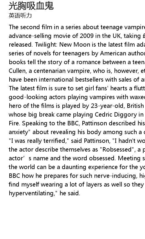 | The second film in a series about teenage vampires has become the fastest advanceselling movie of 2009 in the UK, taking 1m even before it has been released. Twilight: New Moon is the latest film adaptation from the fourpart series of novels for teenagers by American author Stephanie Meyer. The films and books tell the story of a romance between a teenage girl, Bella, and Edward Cullen, a centenarian vampire, who is, however, eternally youthful. The novels have been international bestsellers with sales of around 85m copies worldwide. The latest film is sure to set girl fans' hearts a flutter as it is packed with goodlooking actors playing vampires with waxed pecs and sixpacks. The vampire hero of the films is played by 23yearold, British actor Robert Pattinson, whose big break came playing Cedric Diggory in Harry Potter and the Goblet of Fire. Speaking to the BBC, Pattinson described his feelings of " incredible anxiety" about revealing his body among such a cast of wellmuscled young stars. " I was really terrified," said Pattinson, " I hadn' t worked out at all." Fans of the actor describe themselves as " Robsessed", a play on words between the actor' s name and the word obsessed. Meeting such fans at film premieres around the world can be a daunting experience for the young cast. Pattinson told the BBC how he prepares for such nerveinducing, highlycharged events. " I always find myself wearing a lot of layers as well so they can' t see you hyperventilating," he said. |