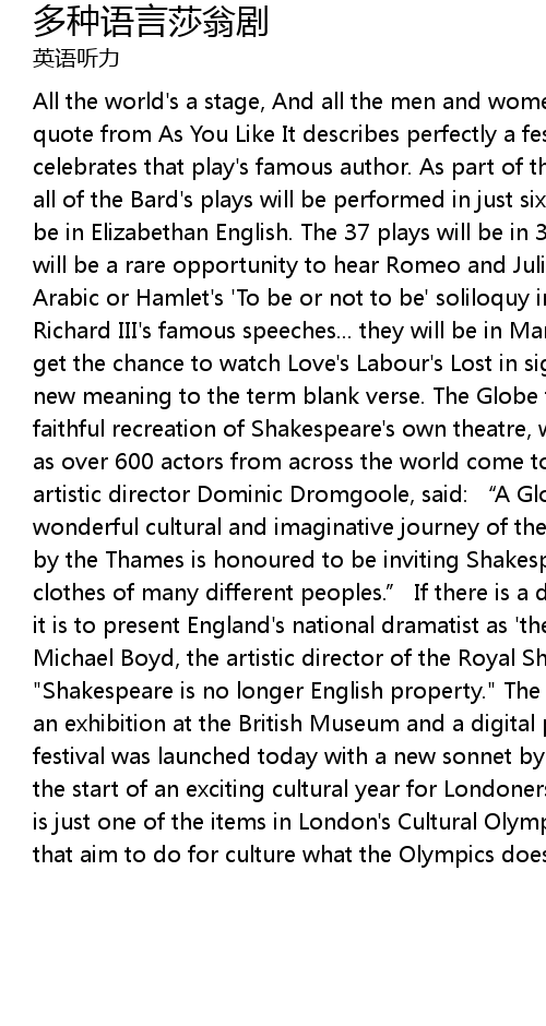 | All the world' s a stage, And all the men and women merely players... This famous quote from As You Like It describes perfectly a festival starting today, which celebrates that play' s famous author. As part of the World Shakespeare Festival, all of the Bard' s plays will be performed in just six weeks but they won' t be in Elizabethan English. The 37 plays will be in 37 different languages. It will be a rare opportunity to hear Romeo and Juliet' s balcony scene delivered in Arabic or Hamlet' s ' To be or not to be' soliloquy in Lithuanian. And as for Richard III' s famous speeches... they will be in Mandarin. Audiences will also get the chance to watch Love' s Labour' s Lost in sign language, which brings a new meaning to the term blank verse. The Globe theatre on London' s Southbank, a faithful recreation of Shakespeare' s own theatre, will be living up to its name as over 600 actors from across the world come to tread its boards. The Globe' s artistic director Dominic Dromgoole, said: " A Globe by the Thames is where the wonderful cultural and imaginative journey of these plays began. Another Globe by the Thames is honoured to be inviting Shakespeare back home, dressed in the clothes of many different peoples." If there is a defining aim of the festival it is to present England' s national dramatist as ' the world' s playwright'. As Michael Boyd, the artistic director of the Royal Shakespeare Company put it: " Shakespeare is no longer English property." The celebrations will also include an exhibition at the British Museum and a digital project, myShakespeare. The festival was launched today with a new sonnet by Mark Ravenhill. The events are the start of an exciting cultural year for Londoners. The Shakespeare festival is just one of the items in London' s Cultural Olympiad the series of events that aim to do for culture what the Olympics does for sport. |