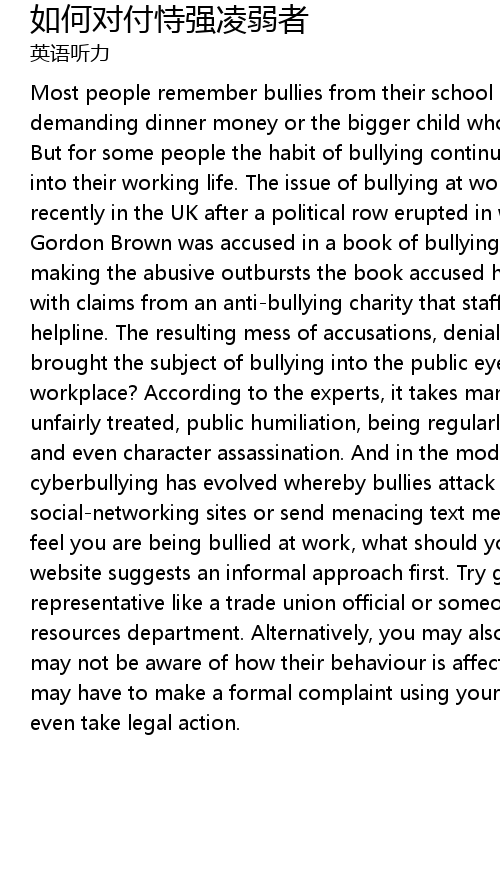 | Most people remember bullies from their school days the unpleasant gang demanding dinner money or the bigger child who picks on smaller, weaker kids. But for some people the habit of bullying continues beyond their schooldays and into their working life. The issue of bullying at work has become a hot potato recently in the UK after a political row erupted in which the UK Prime Minister Gordon Brown was accused in a book of bullying aides at No 10. The PM denied making the abusive outbursts the book accused him of, but was then confronted with claims from an antibullying charity that staff from No 10 had called their helpline. The resulting mess of accusations, denials and resignations has brought the subject of bullying into the public eye. So what is bullying in the workplace? According to the experts, it takes many forms including being unfairly treated, public humiliation, being regularly threatened with the sack, and even character assassination. And in the modern world the phenomenon of cyberbullying has evolved whereby bullies attack their victims on socialnetworking sites or send menacing text messages and emails. So if you feel you are being bullied at work, what should you do? The UK government' s website suggests an informal approach first. Try getting advice from an employee representative like a trade union official or someone in the firm' s human resources department. Alternatively, you may also try talking to the bully who may not be aware of how their behaviour is affecting you. If all else fails you may have to make a formal complaint using your employer' s grievance procedure or even take legal action. |