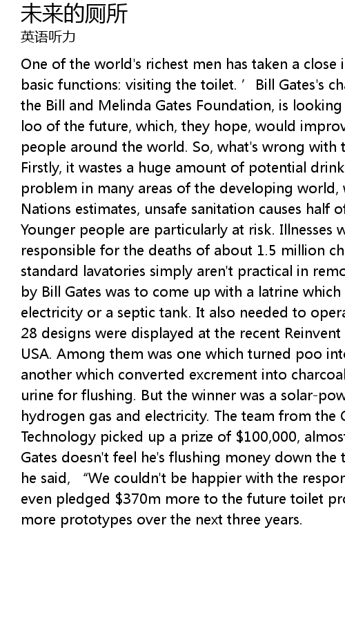 | One of the world' s richest men has taken a close interest in one of man' s most basic functions: visiting the toilet. ' Bill Gates' s charitable organisation, the Bill and Melinda Gates Foundation, is looking for inventors to design the loo of the future, which, they hope, would improve sanitation for millions of people around the world. So, what' s wrong with the traditional flush toilet? Firstly, it wastes a huge amount of potential drinking water. This is a real problem in many areas of the developing world, where, according to United Nations estimates, unsafe sanitation causes half of all hospitalisations. Younger people are particularly at risk. Illnesses which cause diarrhoea are responsible for the deaths of about 1. 5 million children a year. Secondly, standard lavatories simply aren' t practical in remote areas. The challenge set by Bill Gates was to come up with a latrine which works without running water, electricity or a septic tank. It also needed to operate for less than 5 cents. 28 designs were displayed at the recent Reinvent the Toilet fair in Seattle, USA. Among them was one which turned poo into electricity using microwaves, another which converted excrement into charcoal, and yet another which used urine for flushing. But the winner was a solarpowered design which generated hydrogen gas and electricity. The team from the California Institute of Technology picked up a prize of 100, 000, almost 650, 000 RMB. But clearly Bill Gates doesn' t feel he' s flushing money down the toilet. After the Seattle event he said, " We couldn' t be happier with the response we' ve gotten." Gates has even pledged 370m more to the future toilet project. They hope to field test more prototypes over the next three years. |