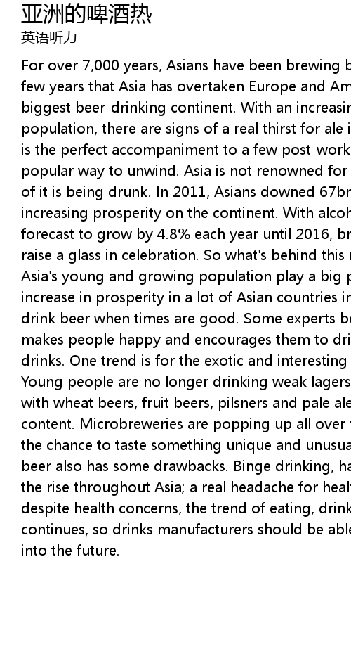 | For over 7,000 years, Asians have been brewing beer. But it's only in the past few years that Asia has overtaken Europe and America to become the world's biggest beer-drinking continent. With an increasingly young and upwardly mobile population, there are signs of a real thirst for ale in Asia. An ice-cold beer is the perfect accompaniment to a few post-work snacks in a bar, and is a very popular way to unwind. Asia is not renowned for making beer, but more and more of it is being drunk. In 2011, Asians downed 67bn litres of beer; a sign of increasing prosperity on the continent. With alcohol consumption in Asia forecast to grow by 4.8% each year until 2016, brewers have every reason to raise a glass in celebration. So what's behind this newfound taste for beer? Asia's young and growing population play a big part, but it also stems from the increase in prosperity in a lot of Asian countries in recent years, as people drink beer when times are good. Some experts believe the fizz factor in beer makes people happy and encourages them to drink more, much like with many soft drinks. One trend is for the exotic and interesting tastes of premium lagers. Young people are no longer drinking weak lagers, but quenching their thirsts with wheat beers, fruit beers, pilsners and pale ales, all with a higher alcohol content. Microbreweries are popping up all over the place, offering consumers the chance to taste something unique and unusual. The increased popularity of beer also has some drawbacks. Binge drinking, hangovers and alcoholism are on the rise throughout Asia; a real headache for health authorities. However, despite health concerns, the trend of eating, drinking and being merry continues, so drinks manufacturers should be able to toast their successes well into the future. |