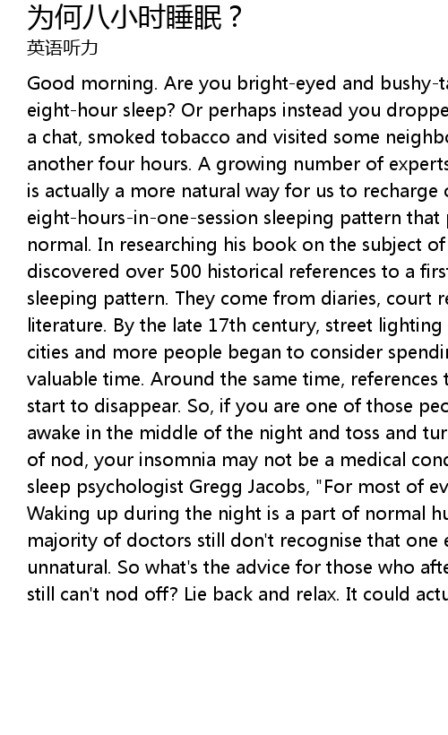 | Good morning. Are you bright-eyed and bushy-tailed after your recommended eight-hour sleep? Or perhaps instead you dropped off for four hours, got up, had a chat, smoked tobacco and visited some neighbours before hitting the sack for another four hours. A growing number of experts are suggesting that the latter is actually a more natural way for us to recharge our batteries than the eight-hours-in-one-session sleeping pattern that people have come to consider normal. In researching his book on the subject of shut-eye, Roger Ekirch discovered over 500 historical references to a first and second segmented sleeping pattern. They come from diaries, court records, medical books and literature. By the late 17th century, street lighting started to appear in cities and more people began to consider spending the night kipping a waste of valuable time. Around the same time, references to a first and second sleep start to disappear. So, if you are one of those people who find themselves wide awake in the middle of the night and toss and turn unable to return to the land of nod, your insomnia may not be a medical condition after all. According to sleep psychologist Gregg Jacobs, "For most of evolution we slept a certain way. Waking up during the night is a part of normal human physiology." But the majority of doctors still don't recognise that one eight-hour slumber might be unnatural. So what's the advice for those who after hours of counting sheep still can't nod off? Lie back and relax. It could actually be good for you. |