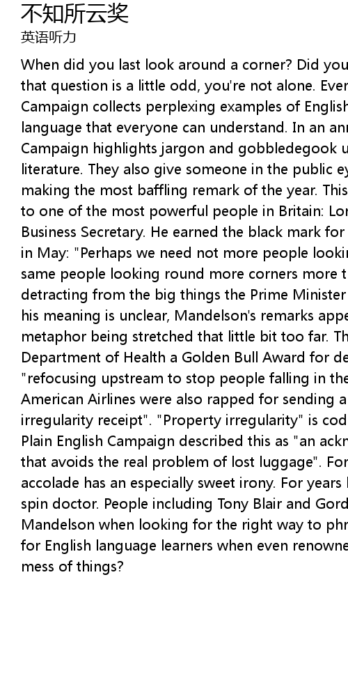 | When did you last look around a corner? Did you do it thoroughly? If you think that question is a little odd, you're not alone. Every year the Plain English Campaign collects perplexing examples of English usage as part of a drive for language that everyone can understand. In an annual awards ceremony, the Campaign highlights jargon and gobbledegook used by official bodies in their literature. They also give someone in the public eye a "Foot in Mouth" award for making the most baffling remark of the year. This year that dubious honour goes to one of the most powerful people in Britain: Lord Mandelson, the government's Business Secretary. He earned the black mark for these comments, which he made in May: "Perhaps we need not more people looking round more corners, but the same people looking round more corners more thoroughly to avoid the small things detracting from the big things the Prime Minister is getting right." Although his meaning is unclear, Mandelson's remarks appear to be a classic example of a metaphor being stretched that little bit too far. The Campaign also awarded the Department of Health a Golden Bull Award for describing an initiative as "refocusing upstream to stop people falling in the waters of disease". Eh? American Airlines were also rapped for sending a passenger a "property irregularity receipt". "Property irregularity" is code for lost luggage. The Plain English Campaign described this as "an acknowledgement sent to a passenger that avoids the real problem of lost luggage". For many Brits, Peter Mandelson's accolade has an especially sweet irony. For years he was the government's top spin doctor. People including Tony Blair and Gordon Brown have turned to Mandelson when looking for the right way to phrase things. What hope is there for English language learners when even renowned masters of communication make a mess of things? |