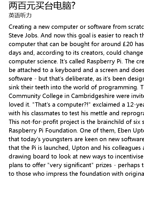 | Creating a new computer or software from scratch is the dream of many a budding Steve Jobs. And now this goal is easier to reach than ever. A new, lowcost computer that can be bought for around 20 has been launched in the last few days and, according to its creators, could change the way teenagers learn computer science. It' s called Raspberry Pi. The credit cardsized machine has to be attached to a keyboard and a screen and doesn' t come with any builtin software but that' s deliberate, as it' s been designed to encourage children to sink their teeth into the world of programming. The pupils of Chesterton Community College in Cambridgeshire were invited to roadtest Raspberry Pi and loved it. " That' s a computer?!" exclaimed a 12yearold boy before piling in with his classmates to test his mettle and reprogramme the classic game Snake. This notforprofit project is the brainchild of six scientists who set up the Raspberry Pi Foundation. One of them, Eben Upton, remains unfazed by suggestions that today' s youngsters are keen on new software but not on how it' s made. Now that the Pi is launched, Upton and his colleagues are already going back to the drawing board to look at new ways to incentivise children into coding. There are plans to offer " very significant" prizes perhaps totalling 1, 000 or more to those who impress the foundation with original programming. |