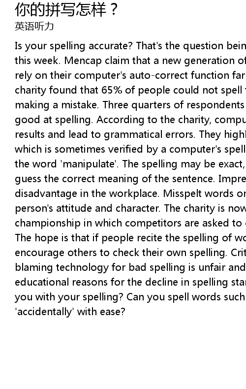 | Is your spelling accurate? That's the question being asked by a British charity this week. Mencap claim that a new generation of people cannot spell, as they rely on their computer's auto-correct function far too much. In a survey, the charity found that 65% of people could not spell the word 'necessary' without making a mistake. Three quarters of respondents also believed they were very good at spelling. According to the charity, computers often provide imperfect results and lead to grammatical errors. They highlighted the word 'manifest', which is sometimes verified by a computer's spell-check, and then replaced by the word 'manipulate'. The spelling may be exact, but the computer is trying to guess the correct meaning of the sentence. Imprecise spelling can also lead to disadvantage in the workplace. Misspelt words on a CV can reflect badly on a person's attitude and character. The charity is now holding a 'Spellathon' championship in which competitors are asked to carefully spell words out loud. The hope is that if people recite the spelling of words from memory, it will encourage others to check their own spelling. Critics have warned that simply blaming technology for bad spelling is unfair and does not address the real educational reasons for the decline in spelling standards. So how meticulous are you with your spelling? Can you spell words such as 'definitely' or 'accidentally' with ease? |