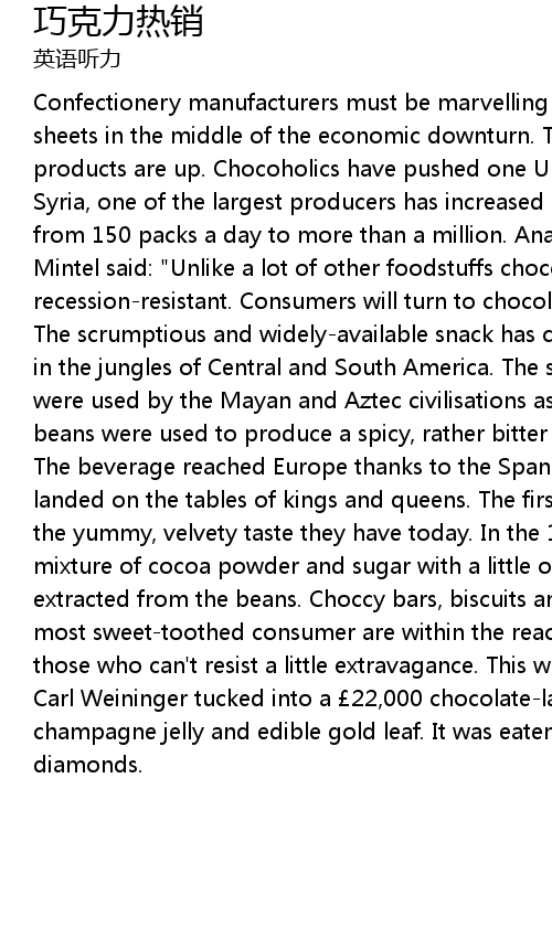 | Confectionery manufacturers must be marvelling at their chocolate box balance sheets in the middle of the economic downturn. That' s because sales of chocolate products are up. Chocoholics have pushed one UK company' s profits up 25. In Syria, one of the largest producers has increased sales over the past six years from 150 packs a day to more than a million. Analyst Marcia Mogelonsky from Mintel said: " Unlike a lot of other foodstuffs chocolate is somewhat recessionresistant. Consumers will turn to chocolate as a reward or a treat." The scrumptious and widelyavailable snack has come a long way from its origins in the jungles of Central and South America. The seeds of the cocoa tree fruit were used by the Mayan and Aztec civilisations as currency. Then, the cocoa beans were used to produce a spicy, rather bitter drink for special occasions. The beverage reached Europe thanks to the Spanish adventurer Hernan Corté s and landed on the tables of kings and queens. The first chocolate bars didn' t have the yummy, velvety taste they have today. In the 1840s, they were a coarse mixture of cocoa powder and sugar with a little of the melted cocoa butter extracted from the beans. Choccy bars, biscuits and drinks that satisfy even the most sweettoothed consumer are within the reach of most people. But there are those who can' t resist a little extravagance. This week, British businessman Carl Weininger tucked into a 22, 000 chocolatelaced pudding that included champagne jelly and edible gold leaf. It was eaten with a gold spoon set with diamonds. |