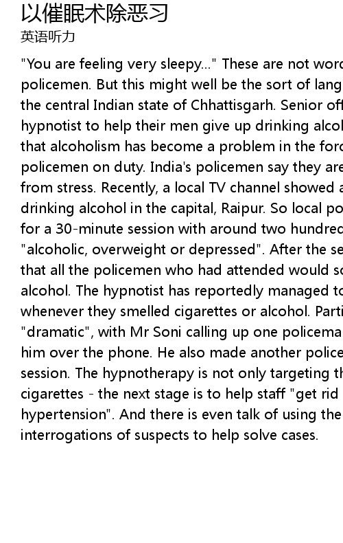 | "You are feeling very sleepy..." These are not words normally addressed to policemen. But this might well be the sort of language directed to officers in the central Indian state of Chhattisgarh. Senior officers there have called in a hypnotist to help their men give up drinking alcohol and smoking. They believe that alcoholism has become a problem in the force, with reports of drunk policemen on duty. India's policemen say they are overworked and many suffer from stress. Recently, a local TV channel showed a policeman passing out after drinking alcohol in the capital, Raipur. So local police hired hypnotist VL Soni for a 30-minute session with around two hundred officers, who were described as "alcoholic, overweight or depressed". After the session ended, Mr Soni announced that all the policemen who had attended would soon kick the habit of consuming alcohol. The hypnotist has reportedly managed to make subjects feel nauseous whenever they smelled cigarettes or alcohol. Participants said the session was "dramatic", with Mr Soni calling up one policeman on his mobile and hypnotising him over the phone. He also made another policeman sing folk songs during the session. The hypnotherapy is not only targeting those hooked on alcohol and cigarettes - the next stage is to help staff "get rid of extra fat and hypertension". And there is even talk of using the hypnotist during interrogations of suspects to help solve cases. |