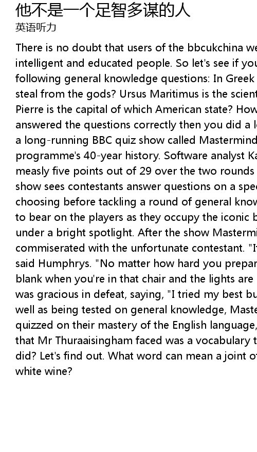 | There is no doubt that users of the bbcukchina website are among the most intelligent and educated people. So let's see if you know the answers to the following general knowledge questions: In Greek mythology what did Prometheus steal from the gods? Ursus Maritimus is the scientific name for which bear? Pierre is the capital of which American state? How did you get on? If you answered the questions correctly then you did a lot better than a contestant on a long-running BBC quiz show called Mastermind, who got the lowest score in the programme's 40-year history. Software analyst Kajen Thuraaisingham scored a measly five points out of 29 over the two rounds of the show. The format of the show sees contestants answer questions on a specialised subject of their choosing before tackling a round of general knowledge. The pressure really comes to bear on the players as they occupy the iconic black leather chair positioned under a bright spotlight. After the show Mastermind's host John Humphrys commiserated with the unfortunate contestant. "It's the 'black chair' syndrome," said Humphrys. "No matter how hard you prepare for a show, the mind can just go blank when you're in that chair and the lights are on you." Mr Thuraaisingham was gracious in defeat, saying, "I tried my best but it wasn't my night." As well as being tested on general knowledge, Mastermind contestants are sometimes quizzed on their mastery of the English language, and indeed the final question that Mr Thuraaisingham faced was a vocabulary test. Can you do better than he did? Let's find out. What word can mean a joint of pork, to pawn, or a German white wine? |