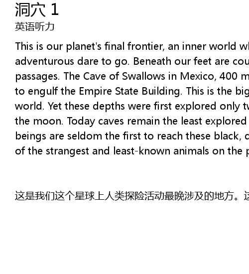 | zhè shì wǒ men zhè gè xīng qiú shàng rén lèi tàn xiǎn huó dòng zuì wǎn shè jí de dì fāng. zhè shì yí gè zhǐ yǒu zuì dà dǎn de tàn xiǎn zhě cái gǎn jìn rù de nèi bù shì jiè. zài wǒ men de jiǎo xià yǒu cháng dù wú fǎ jì suàn de zhòng duō kēng xué hé tōng dào. mò xī gē de yàn zi dòng, shēn dá 400 mǐ, zú yǐ bǎ zhěng gè dì guó dà shà zhuāng rù qí zhōng. zhè shì dì qiú shàng zuì dà de dòng xué, dàn zhí dào rén lèi dēng shàng yuè qiú de qián liǎng nián cái yǒu rén duì tā jìn xíng tàn suǒ. jīn tiān, dòng xué shì rén lèi zài dì qiú shàng tàn suǒ zuì shǎo de dì fāng. ér qiě zhèi xiē hēi àn cháo shī de dòng xué de zuì xiān guāng gù zhě hěn shǎo shì rén lèi. zhè lǐ shēng huó zháo dì qiú shàng yī pī zuì qí tè rén lèi liǎo jiě zuì shǎo de dòng wù. |