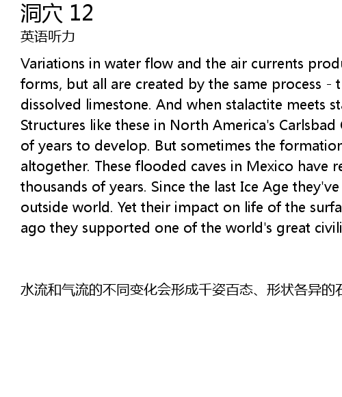 | 水流和气流的不同变化会形成千姿百态、形状各异的石笋,但所有石笋都是由同样的过程形成的,这就是溶解的石灰岩缓慢的堆积。钟乳石和石笋相遇之后,就会形成石柱。位于北美卡尔斯巴德岩洞的这些奇观需要成千上万年才能形成。但有时在某个洞穴中这一过程会完全停止下来。墨西哥的这些洪水淹过的洞穴的结构成千上万年来几乎没有任何改变。自从上一个冰河期之后,它们与外面的世界完全隔绝了,但它们对于地面生命的影响却是巨大的。它们曾经托起了世界上最伟大文明之一的玛雅文明。 |