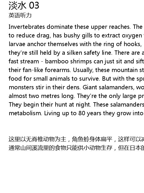 | 这里以无脊椎动物为主,角鱼蛉身体扁平,这样可以减少水的冲力,它还长有灌木一样的鳃,便于吸收水流中的氧气。蚋蝇幼虫凭借附肢上的钩环把自己锚定在水里。即使这样坚持不住,它们还有像丝一样的安全带。在急流中生活自有它的好处。竹节虾只需等在那里,用它扇子一样的前臂过滤那些路过者。 通常山间溪流里的食物只能供小动物生存,但在日本的这一地区,春天融化了冰雪,洞穴里的那些大动物蠢蠢欲动了。这是隐鳃鲵,它们是世界上最大的两栖动物,身长达两米。它们是这片冰冷水域中唯一的大型食肉动物。它们通常晚上出来觅食。它们的寿命可达80年,身体长得很大。 |