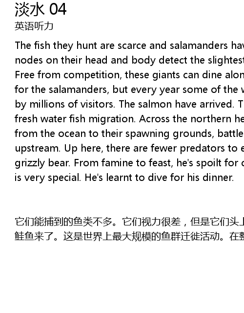 | The fish they hunt are scarce and salamanders have poor eyesight. But sensory nodes on their head and body detect the slightest changes in water pressure. Free from competition, these giants can dine alone. Pickings are usually thin for the salamanders, but every year some of the world' s high rivers are crowded by millions of visitors. The salmon have arrived. This is the world' s largest fresh water fish migration. Across the northern hemisphere salmon, returning from the ocean to their spawning grounds, battle their way for hundreds of miles upstream. Up here, there are fewer predators to eat their eggs and fry. A grizzly bear. From famine to feast, he' s spoilt for choice. This Canadian bear is very special. He' s learnt to dive for his dinner. | |