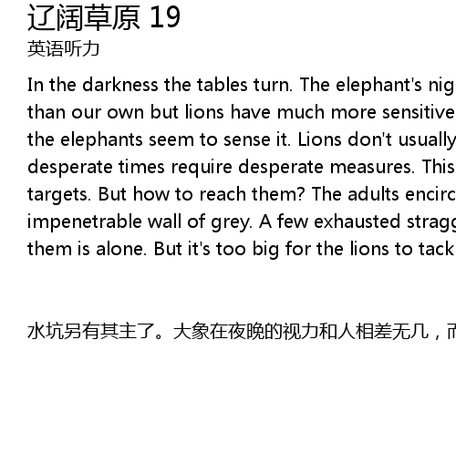| 水坑另有其主了。大象在夜晚的视力和人相差无几,而狮子则有很好的夜视能力。狮子现在很饥饿,大象似乎有所察觉。狮子在通常情况下不会去捕猎大象,但是走投无路的时候也会铤而走险。这群大象里面有容易攻击的小象。但是怎么接近它们呢?大象把小象围住,形成一堵无法穿透的防护墙。这时几只掉队的大象姗姗来迟,其中一只落单了。但个头太大,狮子无法对付。 |