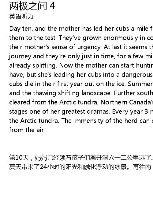 | dì 10 tiān, mā mā yǐ jīng lǐng zhe hái zi men lí kāi dòng xué yī èr gōng lǐ yuǎn le. gāi shì ràng tā men jīng shòu kǎo yàn de shí hòu le. hái zi men de zì xìn xīn dà dà zēng qiáng, dàn hái méi yǒu mā mā nà yàng de jǐn pò gǎn. kàn lái tā men zhōng yú zuò hǎo le yuǎn xíng de zhǔn bèi, tā men bì xū zǒu, yīn wèi lí hǎi àn bù yuǎn chù de bīng miàn yǐ jīng kāi liè. xiàn zài mā mā kě yǐ kāi shǐ bǔ liè tā men lài yǐ shēng cún de hǎi bào le, dàn tóng shí tā yě bǎ hái zi men dài dào le yí gè wēi xiǎn de xīn shì jiè. chà bù duō yǒu yī bàn de xiǎo xióng chū dòng hòu dì yī nián zài bīng shàng sǐ qù. xià tiān dài lái le 24 xiǎo shí de yáng guāng hé róng huà fú dòng de bīng jǐng. zài wǎng nán, běi jí dòng tǔ dài de dōng xuě jī hū kàn bú dào le. zhè shì jiā ná dà běi bù de huāng yě, dà zì rán zài zhè lǐ shàng yǎn tā chǎng miàn zuì hóng dà de xì jù zhī yī. měi nián yǒu 300 wàn zhǐ qiān xǐ de běi měi xún lù cóng běi jí dòng tǔ dài jīng guò. tā de zhuàng guān chǎng miàn zhǐ yǒu cóng kōng zhōng cái néng jìn shōu yǎn dǐ. |