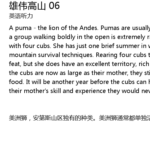 | 美洲狮,安第斯山区独有的种类。美洲狮通常都单独活动,而且行动隐蔽,它们在野外大胆成群活动的情景极为罕见。这是一个家庭,妈妈带着四个孩子。妈妈必须在这个短暂的夏天教会孩子们在这片山区生存下去的本领。把四个孩子养到这么大确实是一件不小的成就,不过,她的这片领地食物丰富,水源充足。虽然小美洲狮体形已经长得和妈妈不相上下,但它们还要依靠妈妈提供食物。还要再过一年它们才能自己寻找猎物。没有妈妈的技能和经验,它们活不过第一个冬天。 |