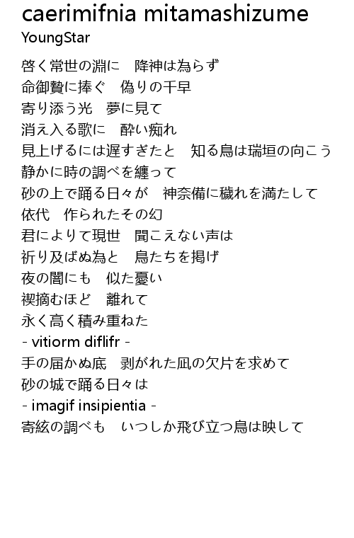| [01:34.44] | 砂の上で踊る日々が 神奈備に穢れを満たして |