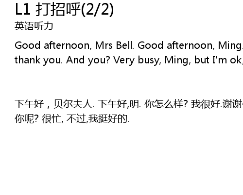 | 下午好,贝尔夫人. 下午好,明. 你怎么样? 我很好.谢谢你. 你呢? 很忙, 不过,我挺好的. |