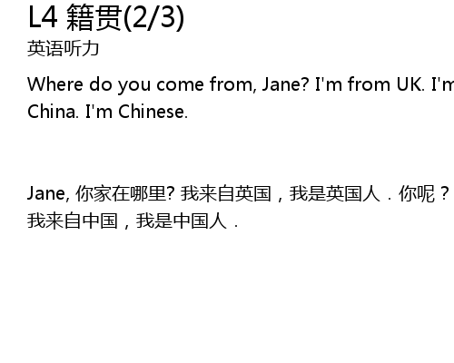 | Jane, 你家在哪里? 我来自英国,我是英国人.你呢? 我来自中国,我是中国人. |