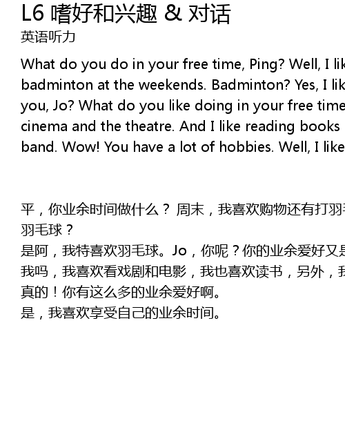 | 平,你业余时间做什么? 周末,我喜欢购物还有打羽毛球。 羽毛球? 是阿,我特喜欢羽毛球。Jo,你呢?你的业余爱好又是什么呢? 我吗,我喜欢看戏剧和电影,我也喜欢读书,另外,我还在乐队里弹吉他。 真的!你有这么多的业余爱好啊。 是,我喜欢享受自己的业余时间。 |