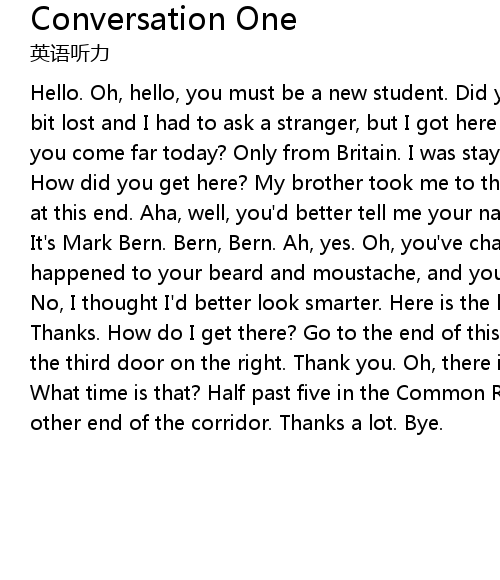 Hello. Oh, hello, you must be a new student. Did you find us, ok? Well, I got a bit lost and I had to ask a stranger, but I got here eventually. Oh, dear. Have you come far today? Only from Britain. I was staying with my brother. Oh, good. How did you get here? My brother took me to the railway station and I got a bus at this end. Aha, well, you'd better tell me your name, so I can find your form. It's Mark Bern. Bern, Bern. Ah, yes. Oh, you've changed since this photo. What happened to your beard and moustache, and you are not wearing glasses, either? No, I thought I'd better look smarter. Here is the key to your room. It is 501. Thanks. How do I get there? Go to the end of this corridor, turn left and it's the third door on the right. Thank you. Oh, there is a meeting for new students. What time is that? Half past five in the Common Room on the ground floor at the other end of the corridor. Thanks a lot. Bye. |